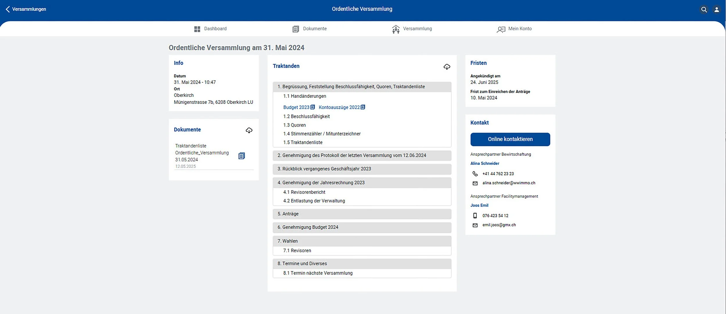 Das Portal ermöglicht den Zugriff auf alle wichtigen Dokumente wie beispielsweise Versammlungsunterlagen, Abrechnungen und Kontoauszüge. Die Kommunikation erfolgt direkt online über Easy Contact. Revisoren erhalten überdies Zugriff auf die Finanzdaten, um die Betriebskostenabrechnungen prüfen zu können.